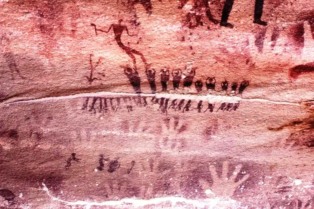 The cave contains dozens of hand stencils, some small enough to belong to children. These marks suggest family groups, communal art, or spiritual signatures.